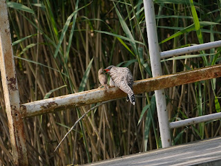 A rare treat….watching a cuckoo being fed by foster parent whilst eating our breakfast on deck |