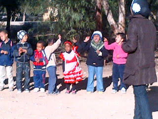 Next morning we were to set of for the desert but first we had a tour of the village primary school. Some children had already arrived and were standing outside under the trees in a semi circle, as each child arrived they were greeted with a handshake and a kiss by both teachers and then they went to join their pals. They don’t have a set time to arrive as some like to sleep later than others, we were there about 9 o’clock and stayed for about an hour and dribs and drabs of children were still arriving. In the meantime the others were singing and chanting enthusiastically. The classrooms were quite well appointed and well equipped and it was interesting to see the similarities between their classroom and mine…..displays on the walls being very similar though of course in Arabic and the self registration picture name cards for the wall, though theirs were hanging on a nail and not stuck on with velcro…..health and safety!!!!
